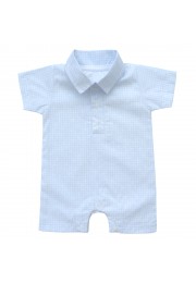 Воротничок ромпера повторяет отворот мужских сорочек и расстегивается благодаря трем кнопочкам. Внизу, по внутренней стороне штанин, также расположены кнопочки, которые позволяют поменять подгузник, не снимая ромпер полностью.