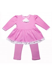 Удобное платье с леггинсами из 100% хлопка с выделкой в маленькую вертикальную полоску. Специальный мягкий, и в то же время, плотный хлопок отлично подходит для прохладной летней погоды, теплой весны или осени, а также зимой под верхнюю одежду. Белые рюши также выполнены из хлопка, но более тонкого.
