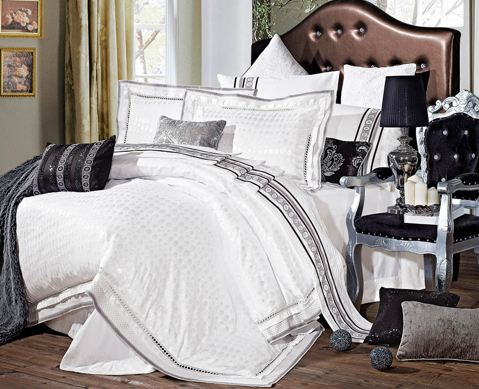 Постельный комплект из жаккарда не оставит равнодушной даже самую избирательную хозяйку. Этот вид хлопкового плетения выглядит действительно дорого - обладает невероятной прочностью, рельефностью рисунка, благородным отливом, прекрасно сохраняет цвет и форму. Такое белье прекрасно впитывает влагу и хранит тепло. Подобрав понравившийся комплект из жаккарда от Jaferi Line, Вы обретете "спутника" на долгие годы, ведь испортить такое белье чрезвычайно сложно! Тело касается та часть комплекта которая состоит из 35 % хлопка.