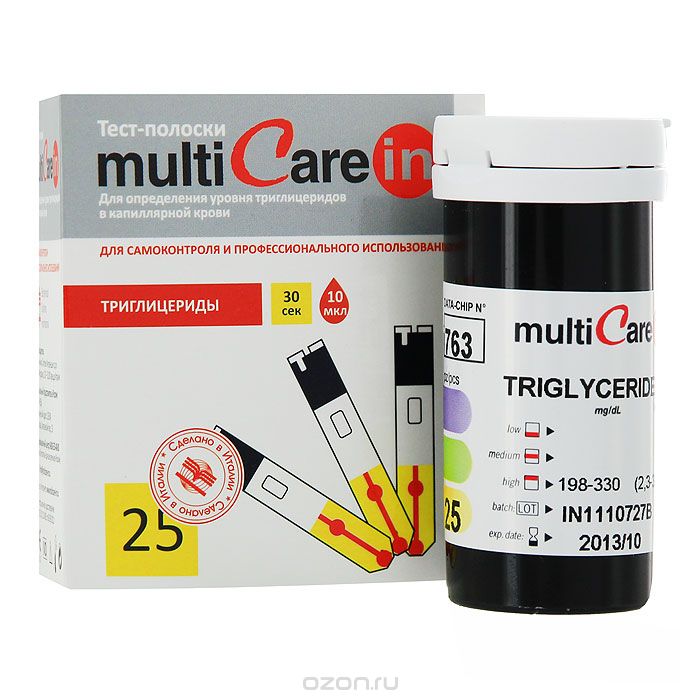 Уровень триглицеридов в крови изменяется под воздействием диеты, при употреблении жирной пищи, изменении метаболизма липидов, сахарном диабете, нефротических синдромах, проблемах поджелудочной железы, хроническим алкоголизме. Результаты измерений необходимо сообщить лечащему врачу для назначения подходящей терапии или для проверки уже назначенной терапии. Тест выполняется строго на голодный желудок, либо спустя 12 часов после последнего приема пищи. К полоскам прилагается код-чип и инструкция по применению на русском языке.