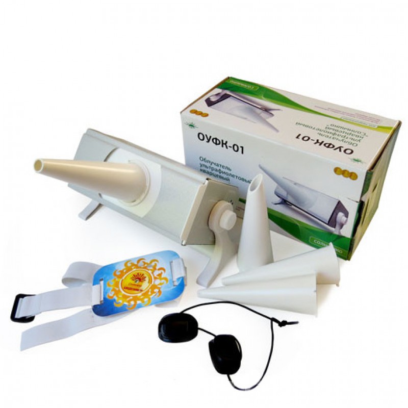 Почти каждый из нас ежегодно и, к сожалению, с завидной регулярностью сталкивается с такой проблемой, как простуда. Избавиться от нее поможет облучатель ультрафиолетовый кварцевый ОУФк-01 <<Солнышко>>. Прибор предназначен для лечебного и профилактического облучения в лечебных учреждениях, а также в домашних условиях. Конструктивно ОУФК-01 Солнышко выполнен в сборном метало - пластиковом корпусе, в котором установлена бактерицидная лампа, являющаяся источником ультрафиолетового излучения. С лицевой стороны корпуса лампа закрыта выдвижным экраном с отверстием для крепления сменных тубусов. Корпус прибора с помощью двух фиксирующих ручек крепится к подставке, что обеспечивает возможность установки корпуса в нужном, для проведения процедуры, положении. При обеззараживании помещений экран полностью вынимается из корпуса кварцевой лампы.